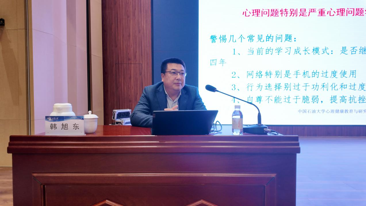 讲座主讲嘉宾为中国石油大学(华东)心理健康教育中心执行主任韩旭东副教授。韩主任结合自身经历以及学生实际案例,从当前大学生心理健康现状及其常见问题入手,到心理健康的几个重要标准,再到提升心理品质的几点建议,最后点出“学会求助,本身就是一种智慧”,给学生带来一场充满智慧与温暖的精彩讲座,为学生如何学习、如何使用手机和网络、如何悦纳自我以及如何求助拨开心灵迷雾,指明了成长的方向。报告既有学术深度,又具情感温度,赢得现场阵阵掌声。
